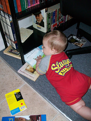 And of course, what would floor travel be without a little discovery, mostly of things he shouldn't be getting into. I'm pleased with his apparent interest in books, but I don't think those books can say the same thing. "But mom, they're so tastey, and it sounds cool when I tear and crumple up the pages." Looks like it's time to invest in some cardboard decoys.